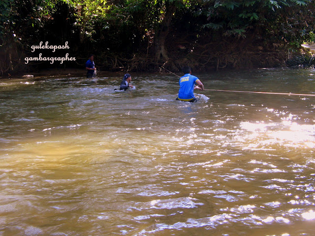 tengah tunjuk demo.oke, air takdelah dalam sangat. ikut ketinggian saya, siap boleh jalan je. tapi mak aiihhh...deras giler air sungai nih. tak paut tali..hanyutlah..hehehe